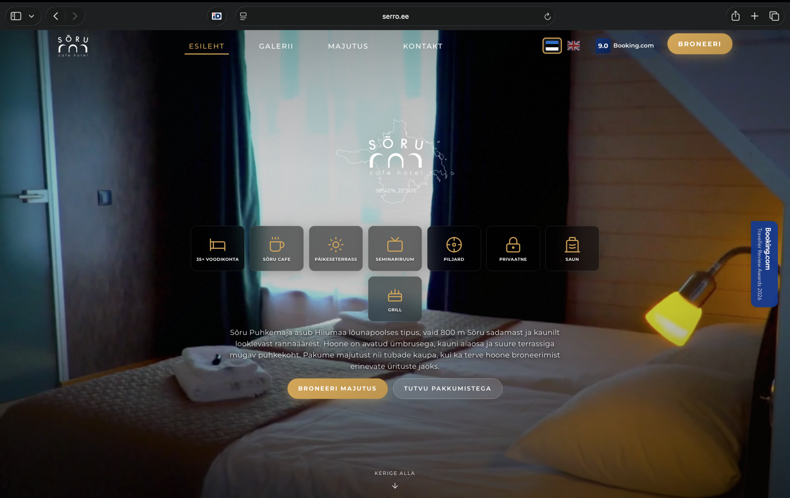Sõru Puhkemaja vajas veebilehte, mis: • Kannaks edasi puhkemaja hubase ja stiilse atmosfääri • Näitaks selgelt majutusvõimalusi ja hinnakirja • Võimaldaks lihtsat broneerimist • Tutvustaks ürituste korraldamise teenust (pulmad, suvepäevad, peod) • Oleks kliendile iseseisvalt hallatav • Töötaks suurepäraselt mobiilseadmetes (turistid otsivad teel olles) Lisaks vajati välireklaami kujundust, et toetada kohalikku turundust Hiiumaal.